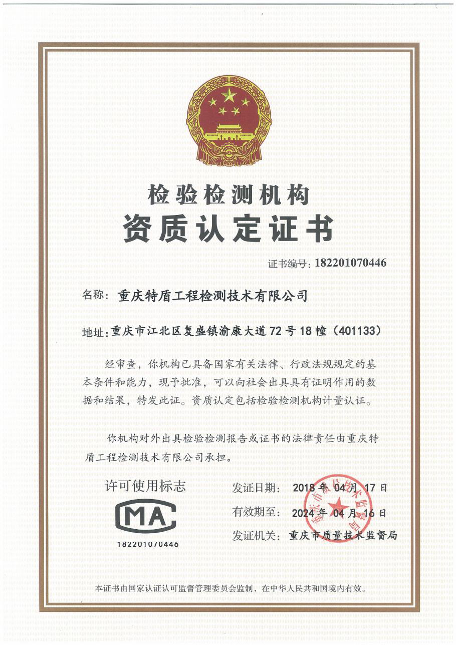 重庆特盾工程检测技术有限公司于2011年成立,现有人员56人,其中检测工程师18名,检测员16名,其他人员33名。检测人员大部分毕业于公路、桥梁、土木、建筑等专业,多年从事试验检测工作,具有丰富的试验检测工作经验。公司现有配套仪器设备370台(套)资产达约500万元。本公司是一个检测人员结构比较合理,检测设备齐全,检测环境条件较好,管理制度健全的检测机构。能按国家规定的行业标准,承担路基工程、路面工程、桥涵工程、隧道工程、等其它附属配套工程和相关成品、半成品、建筑材料的试验检测,能为客户提供科学、可靠的检测数据。