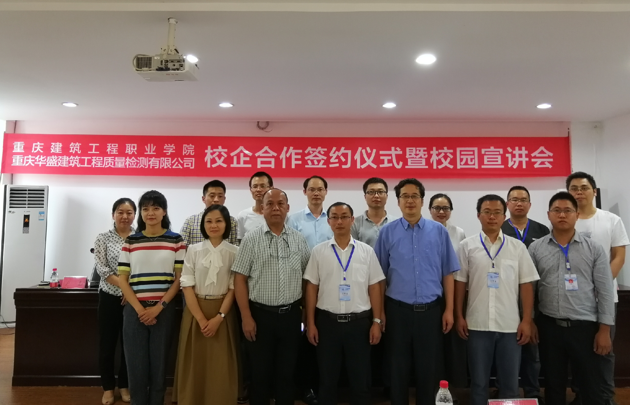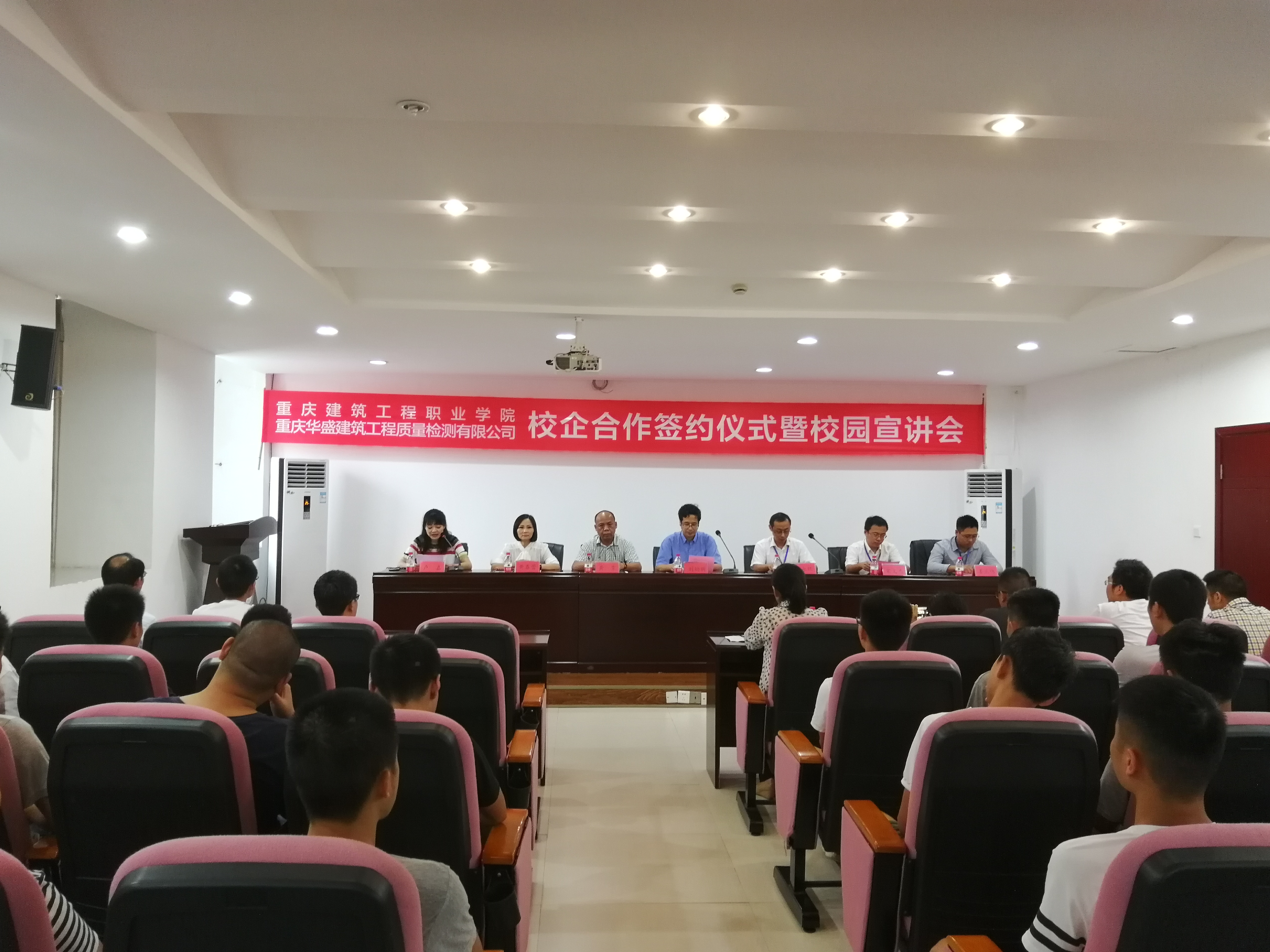 6月21日上午,我院与重庆华盛建筑工程质量检测有限公司(以下简称“华盛检测公司”)举办校企合作签约仪式暨校园宣讲会。学院副院长刘幼昕,招生就业处处长黄霁、交通与市政工程系主任黄春蕾、系党总支书记卢嘉,华盛检测公司副总经理桂永旺、总工程师宋文杰、桥梁检测室主任姜正伟出席会议,双方相关工作人员及16级部分同学参加会议。