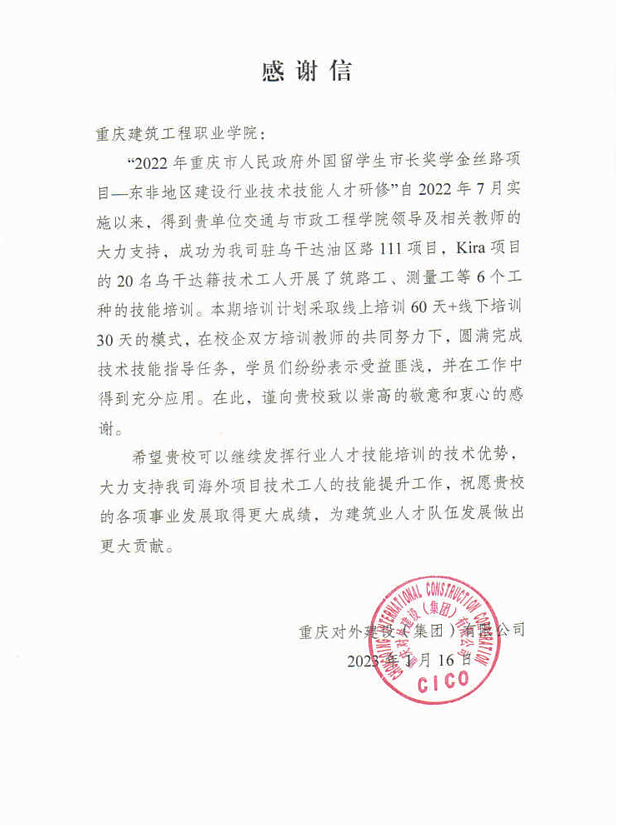 为期3个月的2022年市长奖学金丝路项目“东非地区建设行业技术技能人才研修项目”(以下简称“丝路项目”)已于近日圆满完成。合作企业重庆对外建设(集团)有限公司向学校发来了感谢信,感谢学校长期以来对公司海外发展的支持,对学校协同企业“走出去”培养高质量人才和促进民心相通给予高度评价,并期待进一步加深合作共同发展。
