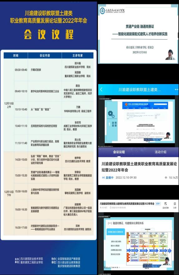 12月10日,川渝建设职教联盟土建类职业教育高质量发展论坛暨2022年年会在腾讯会议上举行,来自川渝地区40余家联盟成员单位、兄弟单位的领导、专家线上参会,直播吸引了10.2万余人次线上观看。中建八局三星堆博物馆新馆项目党支部书记、副总工程师、同济大学路浩博士,四川交通职业技术学院杨甲奇教授,成都工业学院材料与环境工程学院张世凭院长,四川建筑职业技术学院邓林副院长等9位专家围绕土建类职业教育高质量发展分别作报告。