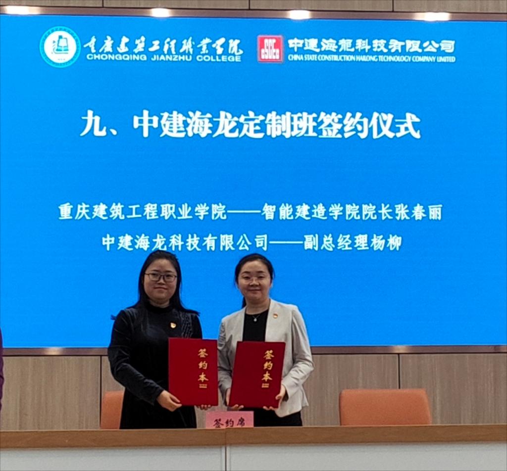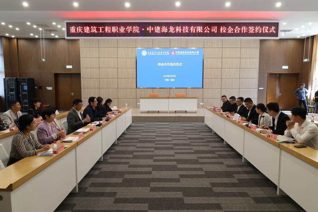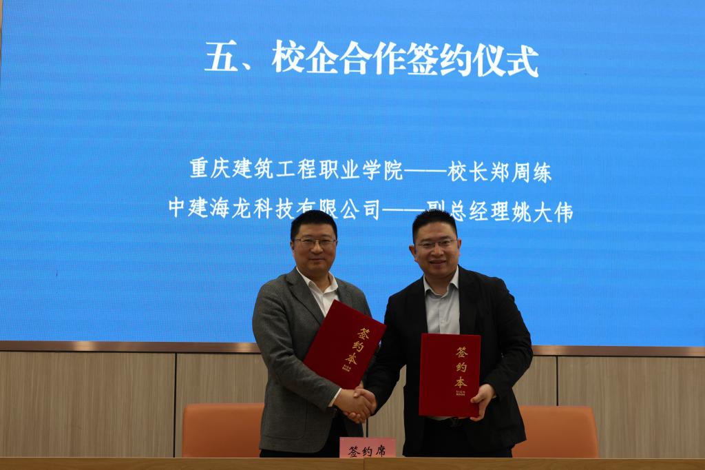 3月29日上午,我校与中建海龙科技有限公司(以下简称“中建海龙”)在建业楼201学术报告厅举行校企合作签约仪式。学校校长郑周练,副校长刘幼昕,副校长陈依民,智能建造学院党总支书记、院长张春丽,中建海龙副总经理杨柳,中建海龙副总经理、重庆海龙两江建筑科技有限公司(以下简称重庆海龙)总经理姚大伟,重庆海龙副总经理侯军,重庆海龙助理总经理唐强,中建海龙设计研发总监杨经纬,中建海龙员工代表,学校党政办、招就处、科发处等职能部门负责人参加。校企合作签约仪式由副校长刘幼昕主持。