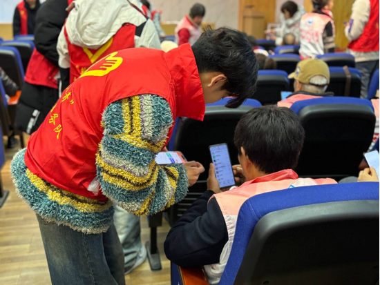 活动中,志愿者们在峡口镇大兴场社区党群服务中心为社区老人做科普教育,通过“基层智治”“文明实践 美好家园”等积分小程序,鼓励大家积极参与到社区的志愿服务中来。