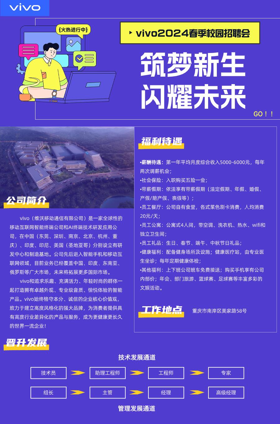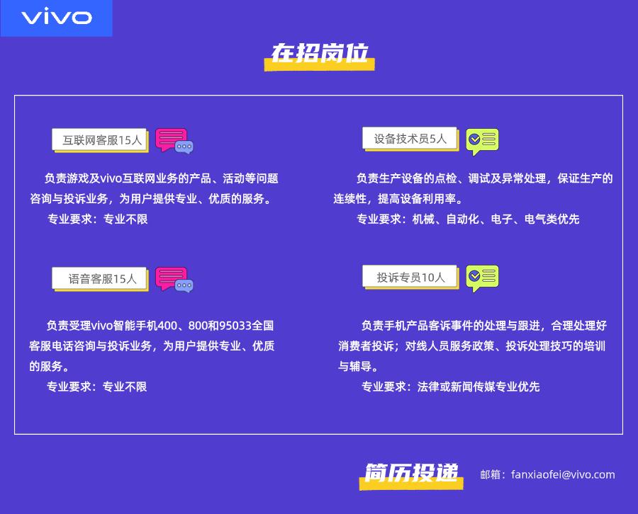 重庆vivo招聘互联网客服、语音客服、网络技术员、投诉专员等岗位,具体要求详见招聘页面。