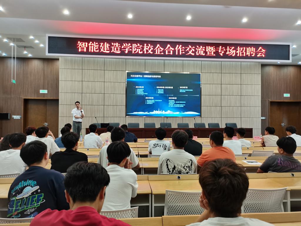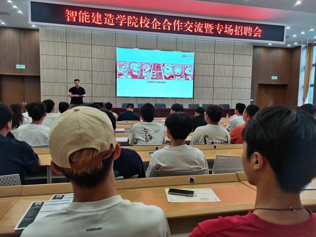 6月18日下午,智能建造学院在建业楼201报告厅举办了2025届毕业生招聘会,学院邀请重庆中建海龙科技有限公司、京东物流两家企业到校招聘。重庆中建海龙科技有限公司助理总经理唐强、京东物流华东区校招主管张引弓等企业负责人分别介绍了企业发展和招聘要求。两家企业此次招聘提供近50个就业岗位。