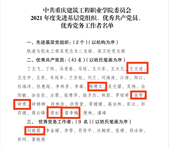 7月7日,在学院庆祝中国共产党成立100周年座谈会上,学院对2021年度先进基层党组织、优秀党务工作者、优秀共产党员进行了表彰,土木总支王文进、杨博文、宗琴、钟焘、曾虹、雷李梅6名同志荣获了“优秀共产党员”荣誉称号,刘晓蓉同志荣获了“优秀党务工作者”荣誉称号。