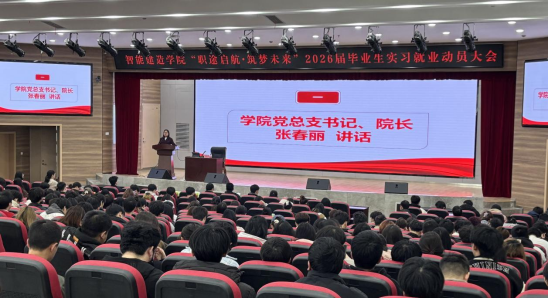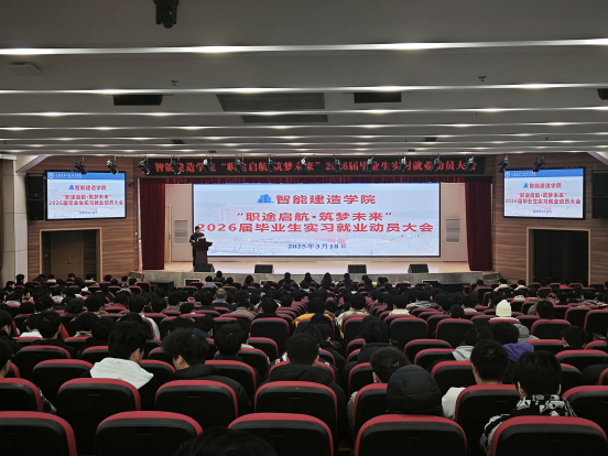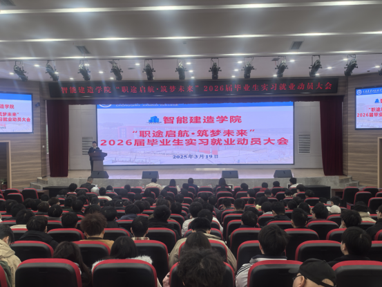 3月18日-3月20日,智能建造学院在图书馆5楼学术报告厅开展了3场“职途启航,筑梦未来”2026届毕业生实习就业动员大会。学院领导、教研室主任、专业带头人、2026届辅导员及2026届全体毕业生齐聚一堂,共同开启这场意义非凡的实习就业动员之旅。大会由学院党总支副书记崔接友主持。