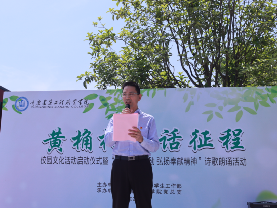 校党委纪委书记赵国致辞。从学校“黄桷树”的故事,讲到学校“十四五”规划的新征程,要求全校师生高度重视,将“黄桷树下话征程”这项长期活动打造成一个校园文化品牌,并勇于创新,充分发挥专业优势,打造“建筑+思政”文化育人品牌。