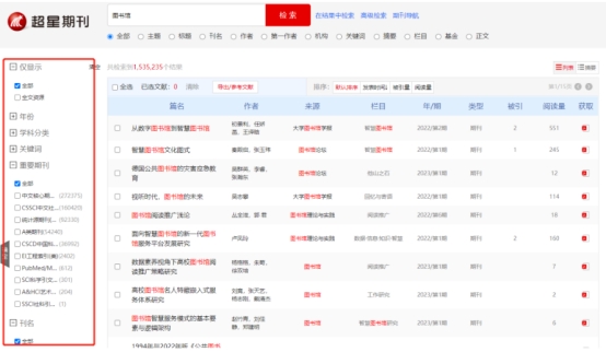 除了基本检索和高级检索外,超星期刊可以通过采用分面分析法,可将搜索结果按各类文献是否有全文的维度、语言维度、学科维度、时间维度、作者维度、机构维度、权威工具收录维度以及全文来源维度等进行任意维度的聚类。而且c,页面左下角的关键词联想功能可根据检索词所属学科推荐关联词汇。