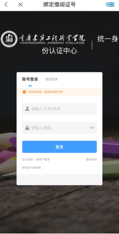 (1)下载安装完成后,打开学习通,点击右下角“我”会出现登录界面。点击“登录/注册”,再点击“新用户注册”,输入手机号、验证码和密码,在“单位认证”界面输入“重庆建筑工程职业图书馆”,弹出“统一身份认证中心”界面,输入“学号”和“一站式登录密码”完成绑定。