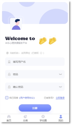 1.将手机网络切换为校园IP范围并关闭移动网络后,打开浏览器输入平台访问地址进入平台首页--->2.点击底部我的按钮进入登录页面--->3.点击立即注册,即可进入注册页面--->4.输入账号、密码和验证码并勾选《用户使用协议》,即可认证注册--->5.若出现认证失败,请切换校内IP网络并关闭移动网络后重新尝试。