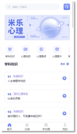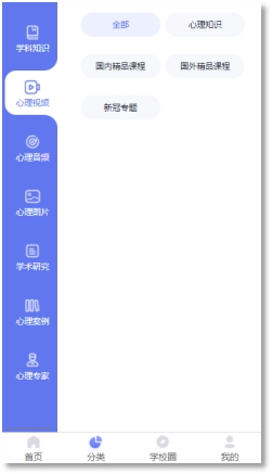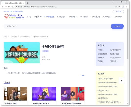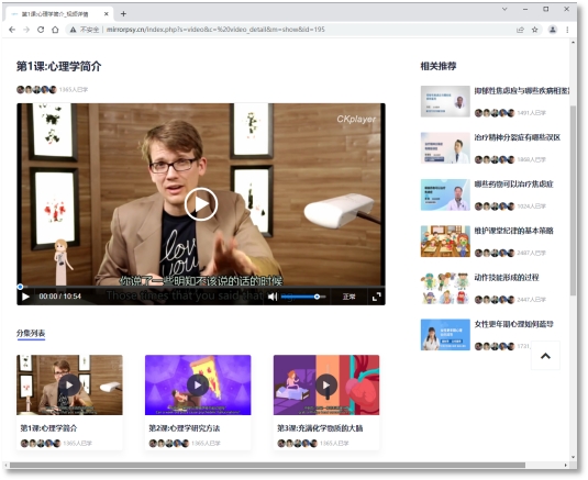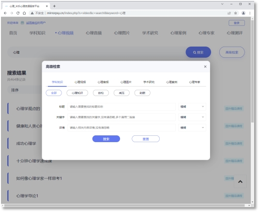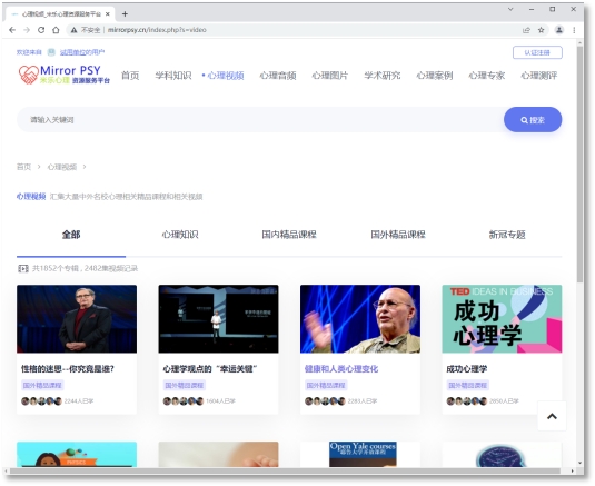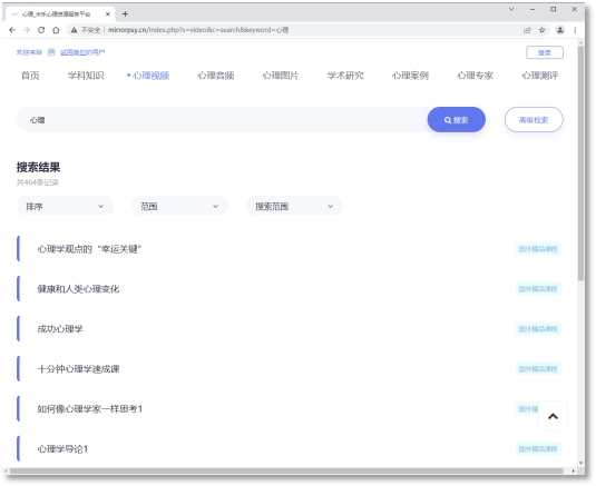 1.内容浏览:通过首页顶部的菜单进入心理视频模块,鼠标上下滚动快速浏览模块内容,可通过模块类型快速切换您感兴趣的内容。