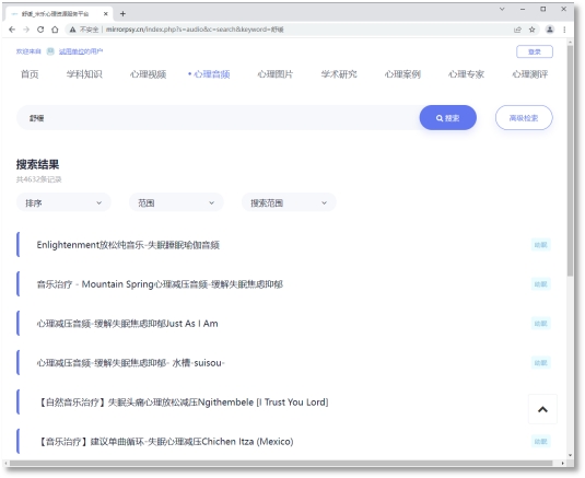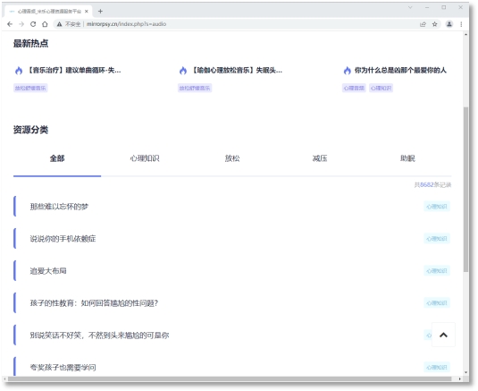 1.音频浏览:通过首页顶部的菜单进入心理音频模块,鼠标上下滚动快速浏览心理音频,点击类型可以快速切换音频类型。