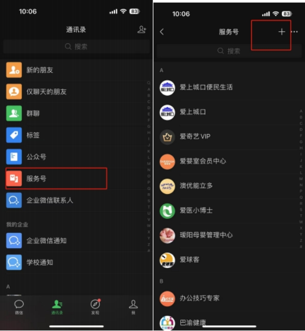 2.点击顶部【服务号】→ 点击右上角【+】图标如下图:
